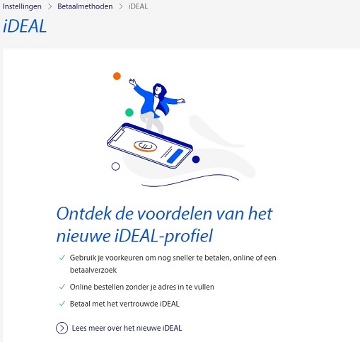 Het nieuwe iDEAL maakt online bestellen en betalen nog makkelijker. iDEAL wordt uitgebreid met een nieuwe betaalpagina en een eigen iDEAL-profiel voor gebruikers. Met de hierin bewaarde gegevens, zoals bijvoorbeeld een bezorgadres, kunnen klanten nog sneller hun bestelling of betaling afronden.